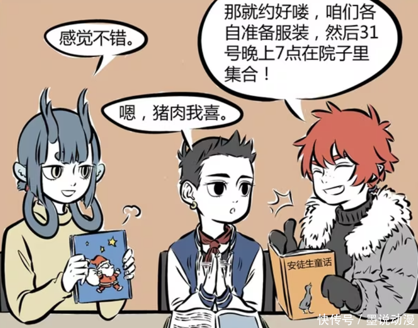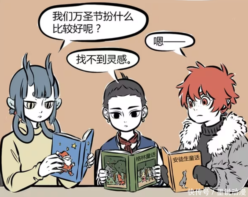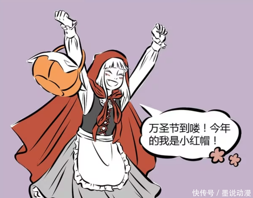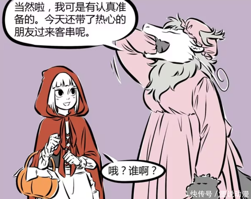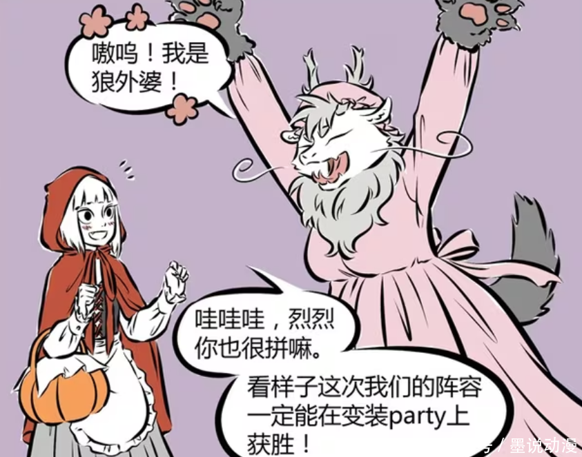 《非东说念主哉》漫画版中押注篮球的app,九月、敖烈、哪吒等东说念主偶尔会出cosplay。罕见是哪吒,可爱cos的脚色还不少。不外这一次是万圣节主题,九月演出小红帽,敖烈演出狼外婆,即是真外婆,皆用翻车鱼来代替。至于哪吒、红孩儿和龙女,则是cos三只小猪。