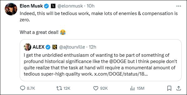马斯克当场在他的个东谈主X账号补充说,这是一项“莫得酬劳”的职责。