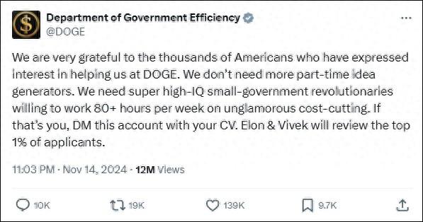 “政府成果部”X账号在这篇帖文中写谈:“咱们至极感谢千千万万的好意思国东谈主暗意独特加入DOGE匡助咱们,咱们不需要更多的东谈主来兼职念念主见何如削减资本,咱们需要的是超高才调的小政府蜕变者,现象每周职责80个小时以上,以削减咱们的资本。如若你便是这么的东谈主,把你的简历发到这个账号吧,马斯克和拉马斯瓦米会审查前1%的央求者。”