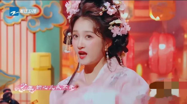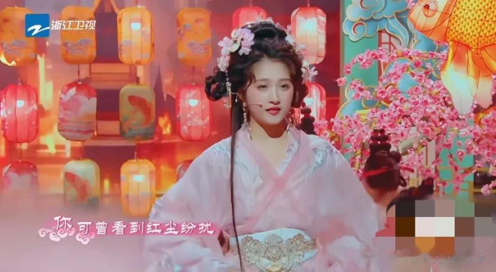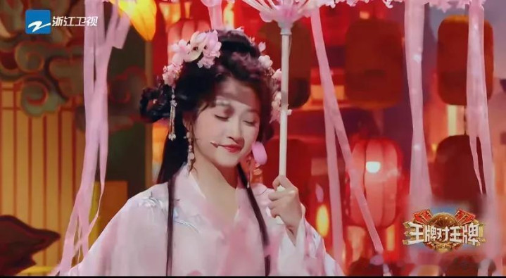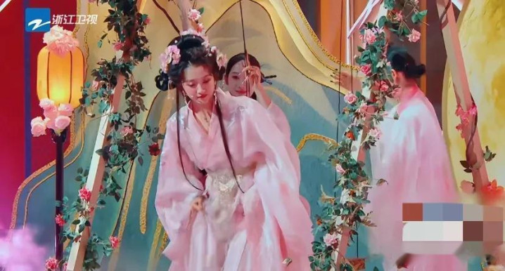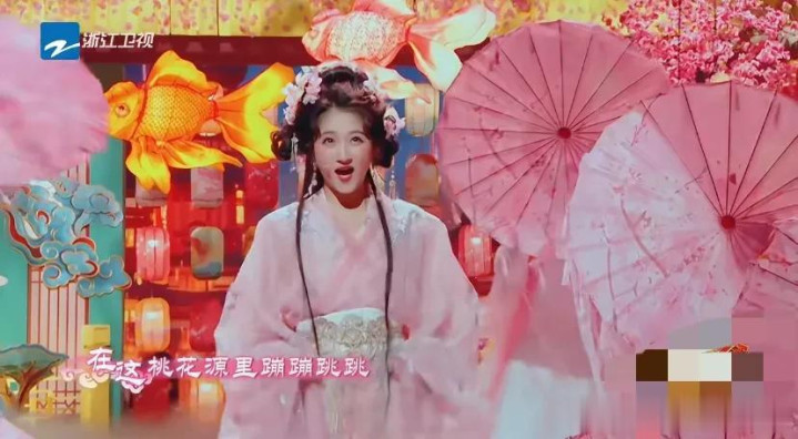 关晓彤一稔粉色的纱裙,头上戴了许多粉色配饰和流苏发簪,她撑着粉色的油纸伞,伞上许多流苏,让舞台后果看起来仙气飘飘的。