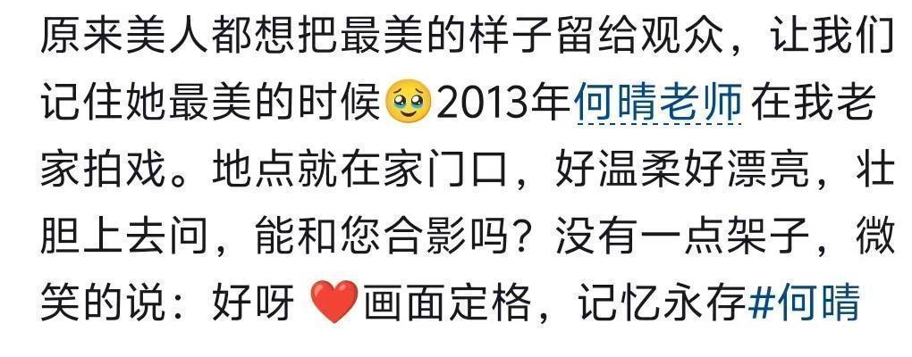 这些素东谈主博主大多皆提到,何晴很亲切,她会邀请素东谈主坐她的车、饱读舞素东谈主,对合影条目也会负责答理,内心几乎即是个天神。