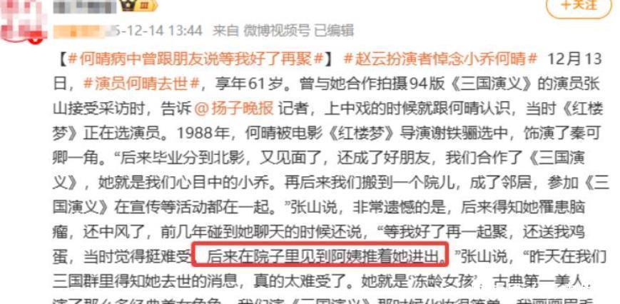 可她的辞谢和她凄凉的晚年生存不太匹配,几位对何晴情况相比老到的好友,皆提到了她晚年叛逆病魔生存中的寂然,连接是由邻居、护工送去病院。