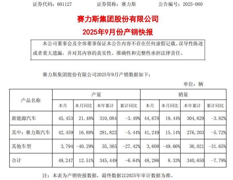 从销量来看,本年1—9月赛力斯新动力汽车累计销量达304,629辆,其中问界品牌累计销量为 28.7 万辆,占其新动力汽车总销量的 94.2%。2025年9月赛力斯新动力汽车销量 44,678 辆,同比增长19.44%,其中问界 M9、M8 等主力车型孝敬显耀。