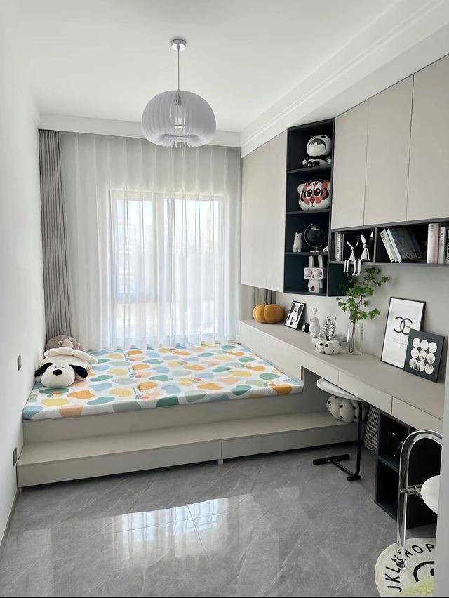 卧室是家的精巧空间,这个家的卧室一样罗致了咖色系装修。床头配景墙遴荐了深咖色,与床品和窗帘的咖色相呼应。卧室的居品也齐是从简立场的,既实用又好意思不雅。此外,卧室还配备了一个大衣柜和一张书桌,满足了居住者的平素需求。