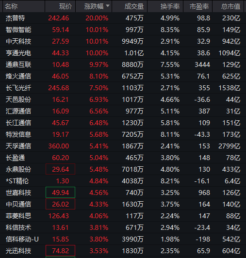 通讯征战板块施展强势,杰普特20%涨停,智微智能、中天科技、亨通光电、通鼎互联等纷繁涨停。