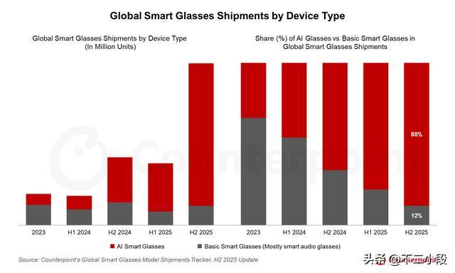 Counterpoint的数据炫耀,2025年下半年全球智能眼镜出货量同比增长139%。Omdia统计的2025年全年AI眼镜出货量达到870万台。