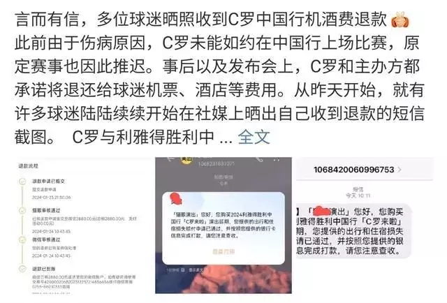 在香港所作念的这些,忽悠了这样多球迷梅西甚而还和没事发生一样,相同是无法登场,望望此前C罗原定于2月中国深圳行的派头,提前召开新闻发布会示知球迷我方因伤缺席,甚而还躬行说念歉标明我方的派头,还愉快此次中国行不是取消而是展期,会再次转头的。终末也保证一定会把球迷所购买的机票,门票和酒店用度全额退款,这便是C罗和他团队的魄力。而在最近这一周技术里,依然继续有球迷默示依然退款依然到账了。