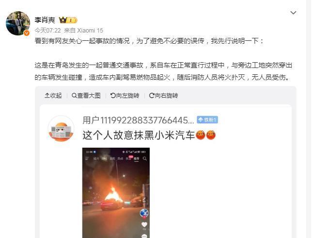 6月11日,《辟谣财知说念》严防到,针对网罗上等闲传播的“青岛一辆小米汽车着火视频”,小米汽车副总裁李肖爽通过微博发文进行讲解。